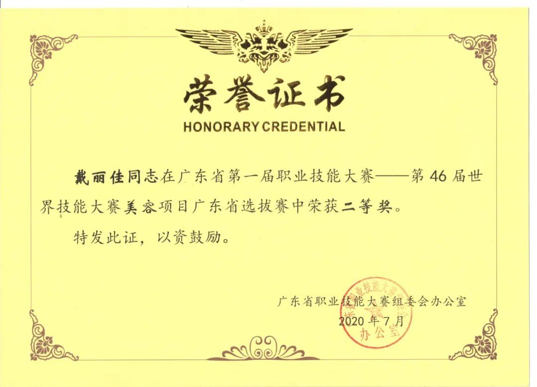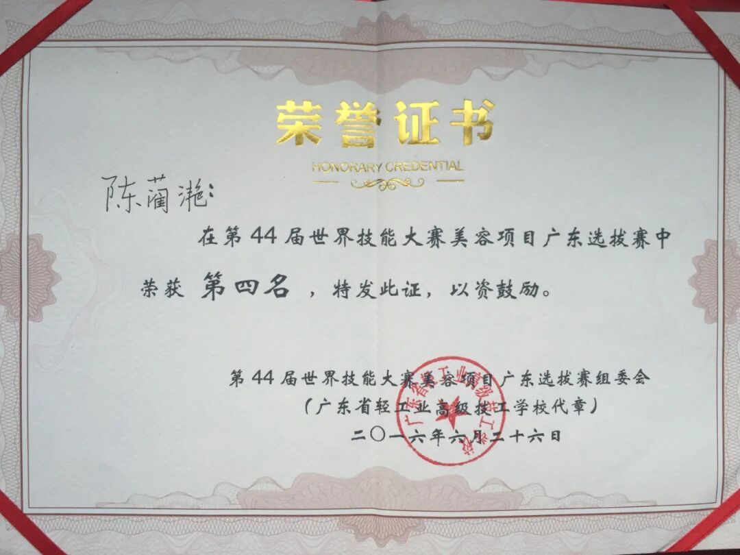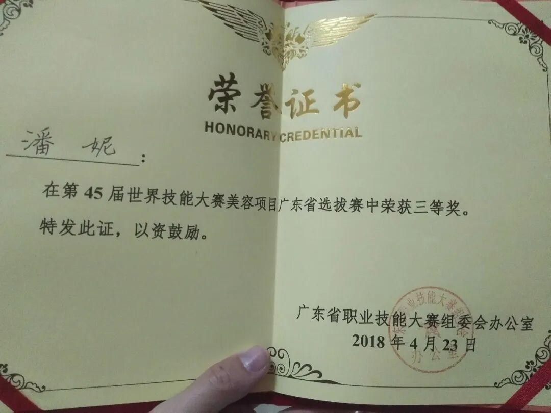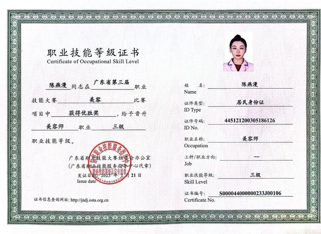 学子陈燕漫获广东省第三届职业技能大赛美容项目优胜奖及职业技能等级证书