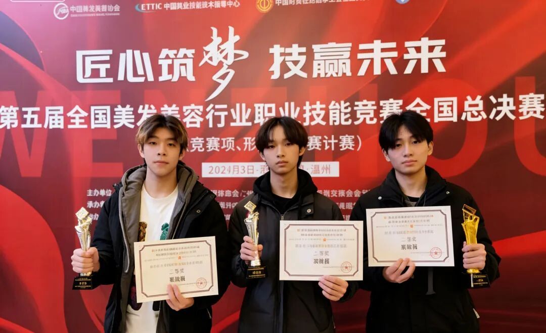 王泽立、汤康晨、李晓峰三位同学参加第五届全国美发美容行业职业技能竞赛荣获一等奖一名、二等奖两名