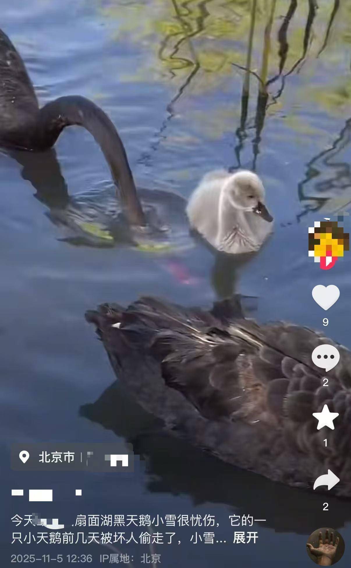 市民发帖称,扇面湖一只黑天鹅幼雏疑似被人偷走。视频中,两只黑天鹅旁只有一只幼雏,此前照片中有两只幼雏。
